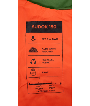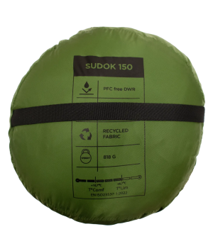 Det lätta men slitstarka yttertyget är tillverkat av återvunnen 20D ripstop-nylon, som är tillräckligt tåligt för friluftsliv utan att ta onödigt mycket plats. Sudok 150 är avsedd för sommaren, med en komforttemperatur på +10,7 °C och en gränstemperatur på +6,7 °C. Sovsäcken är testad enligt standarden EN ISO 23537-1:2022.