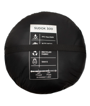 Det lätta men slitstarka yttertyget är tillverkat av återvunnen 20D ripstop-nylon, som är tillräckligt tåligt för friluftsliv utan att ta onödigt mycket plats. Sudok 300 är utformad för sommaren, med en komforttemperatur på +4,0 °C och en gränstemperatur på -1,2 °C. Sovsäcken är testad enligt standarden EN ISO 23537-1:2022.