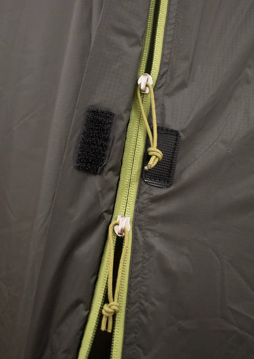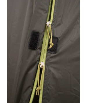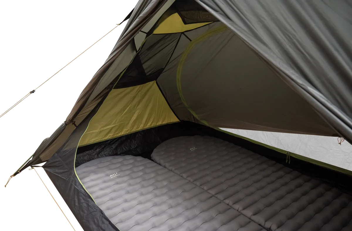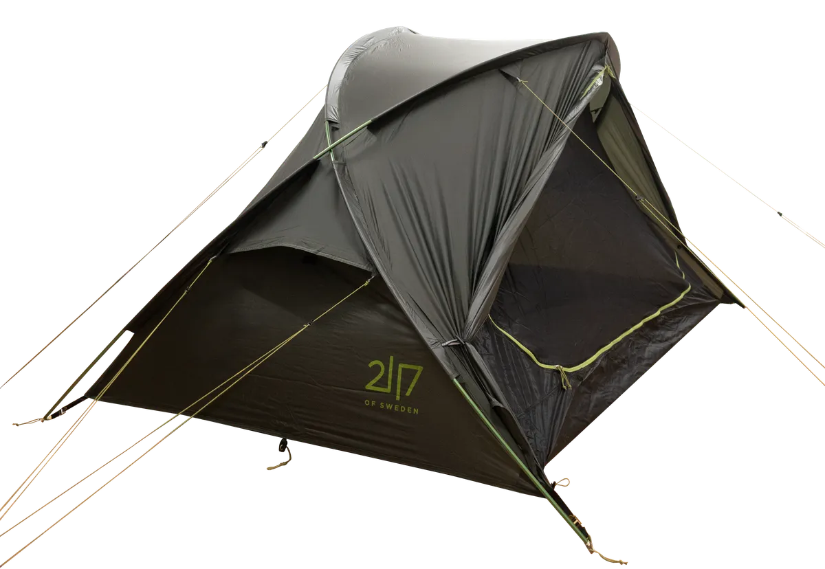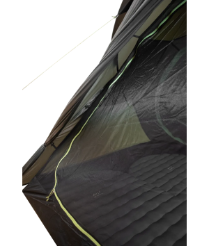 Yttertält: 20D 380T återvunnen nylon ripstop, silikonbelagd, PU 3000 mm. Innermaterial: Andningsbart nylonnät. Golv: 20D 380T återvunnen nylon ripstop, silikonbelagd, PU 5000 mm. Stänger: Aluminium 7075, 9,5 mm